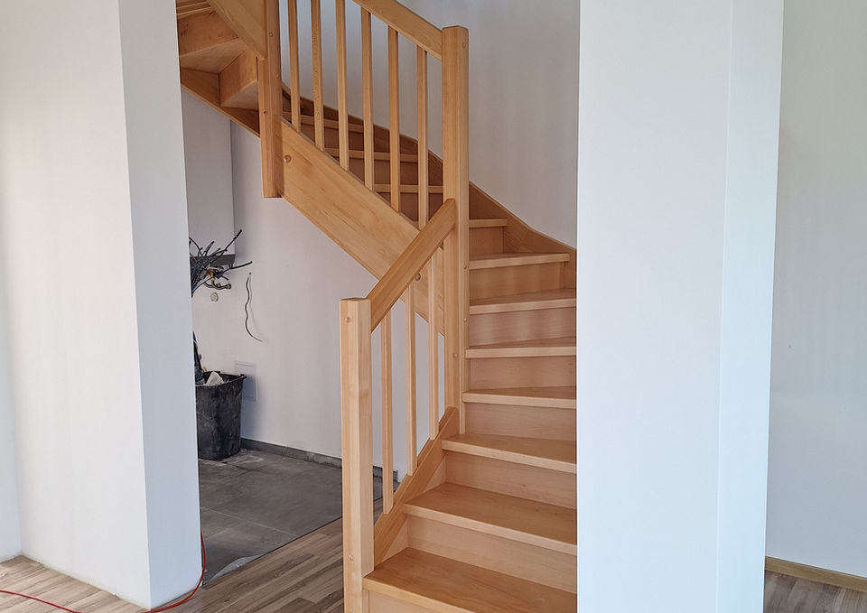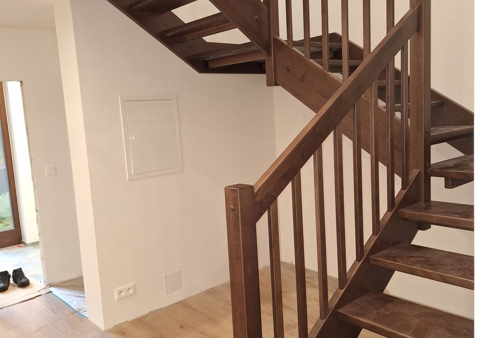 Schodiště do tvaru ,,L" bukové bez podstupnic s podestou na soklu, v patře cca 7 metrů zábradlí a svislé zadělání trojúhelníku.