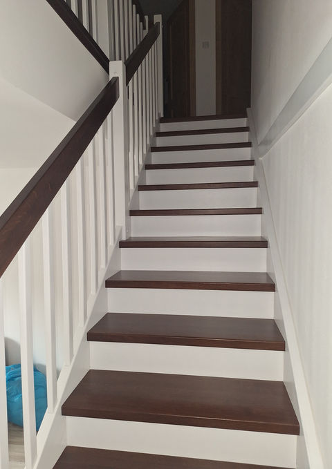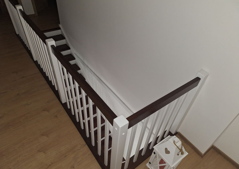 Schodiště do tvaru ,,L, dubové s podstupnicemi, barevně upravené mořením doplněné krycí bílou barvou. V patře cca 4 metry zábradlí.