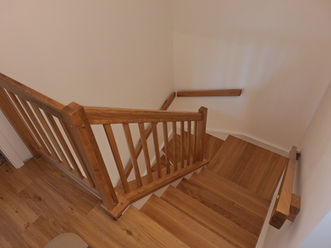 Schodiště do tvaru ,,U" dubové, s podstupnicemi, barevně upravené mořením, 2 metry zábradlí ve druhém patře.