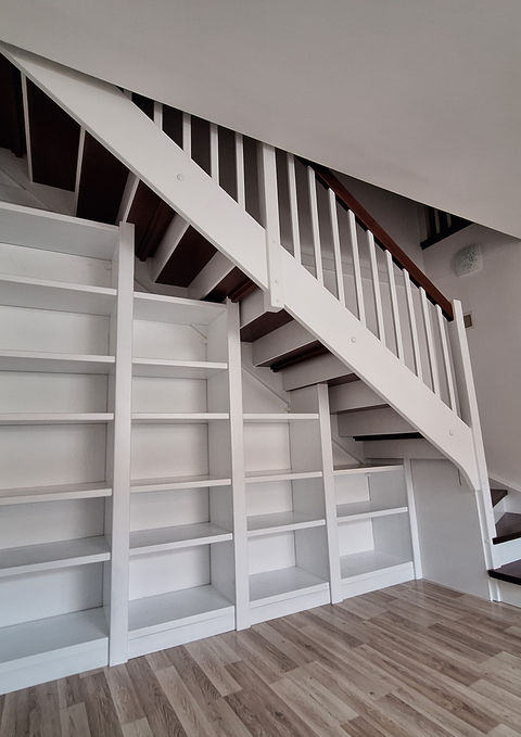 Schodiště mezi stěny s podstupnicemi, doplněné bílou barvou, v patře cca 1 metr zábradlí. Pod schodištěm vznikla úložná místnost.