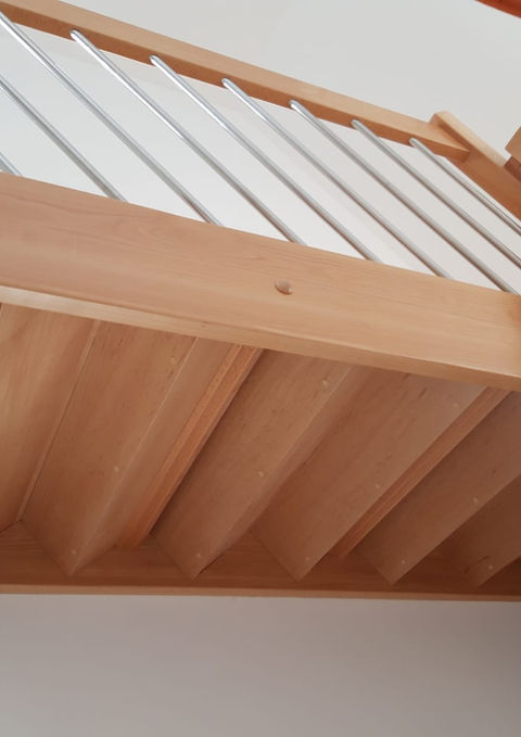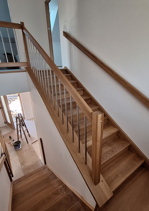 Schodiště do tvaru ,,L" bukové bez podstupnic, barevně upravené mořením, v patře cca 2,5 metrů zábradlí.