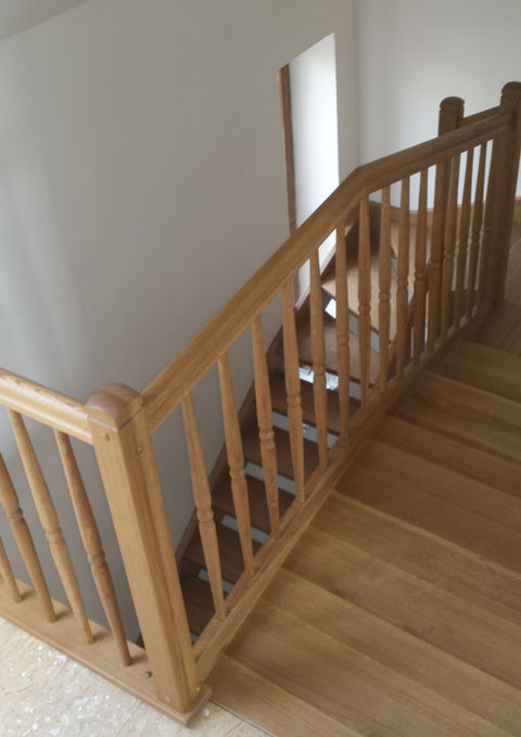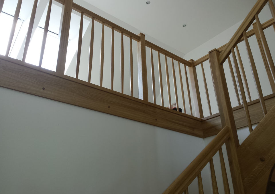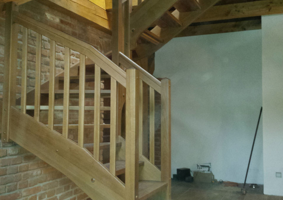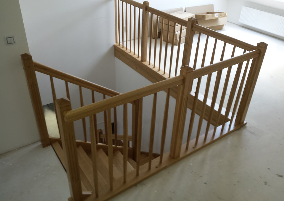 Schodiště do tvaru ,,U dubové bez podstupnic, v patře cca 5,5 metrů zábradlí. Rustikálnější provedení.